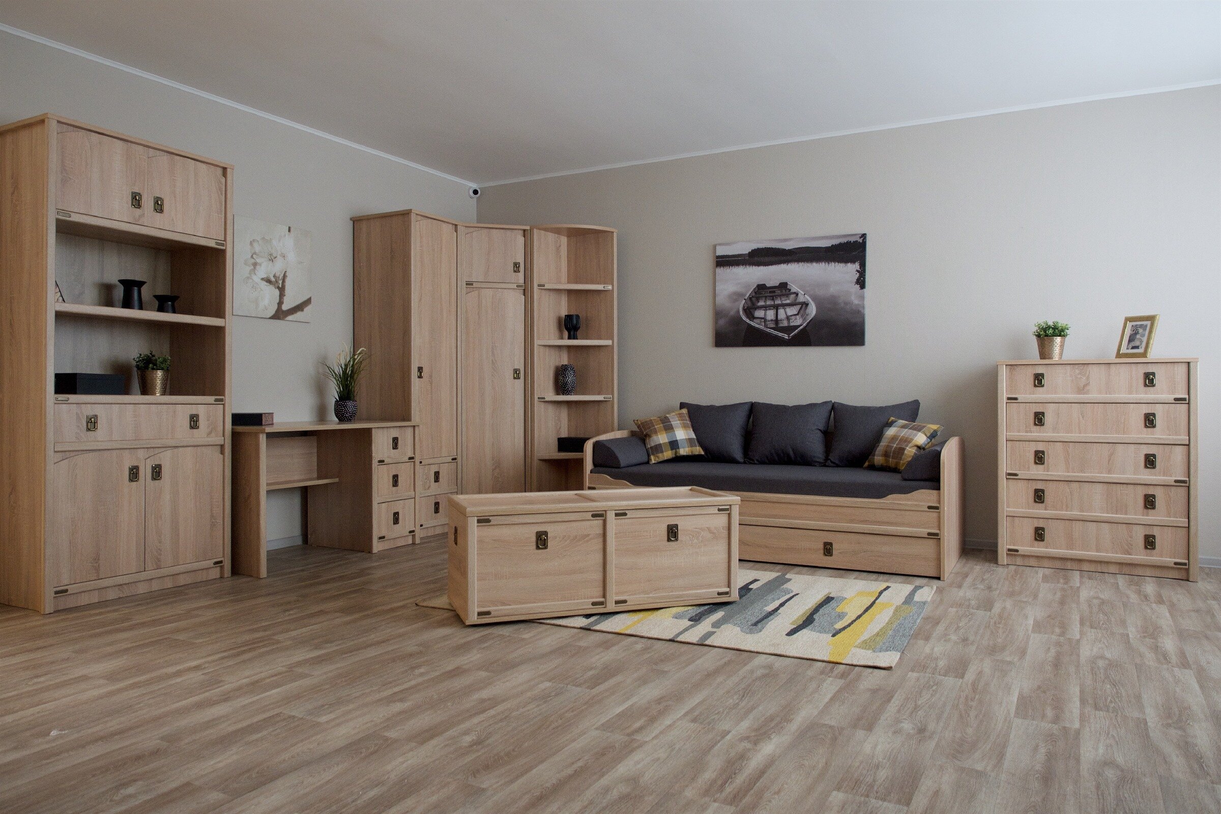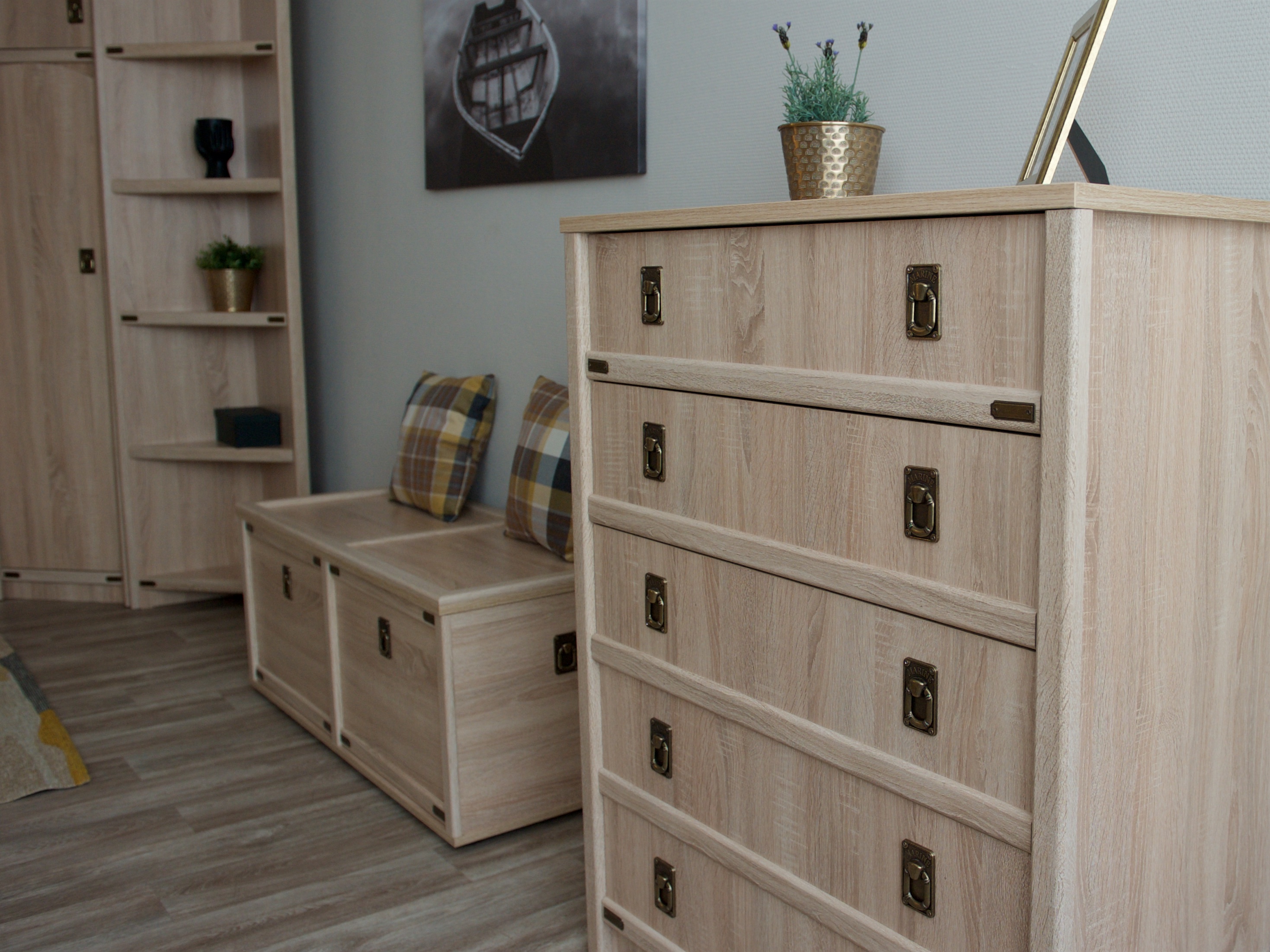 Детская Валенсия - отличное решение для детей любой возрастной категории. Все модули этой системы максимально функциональны и вместительны. Разнообразие модулей позволит Вам подобрать оптимальный комплект. Декоративные элементы создают яркий морской стиль этого комплекта. В этой модели предлагается более компактное решение двуспальной кровати, чем многоярусная кровать, съедающая слишком много пространства. При этом есть возможность превратить кровать в диван. Жемчужина модели – сундук. При относительно демократичной цене в комплекте использованы высококачественные материалы