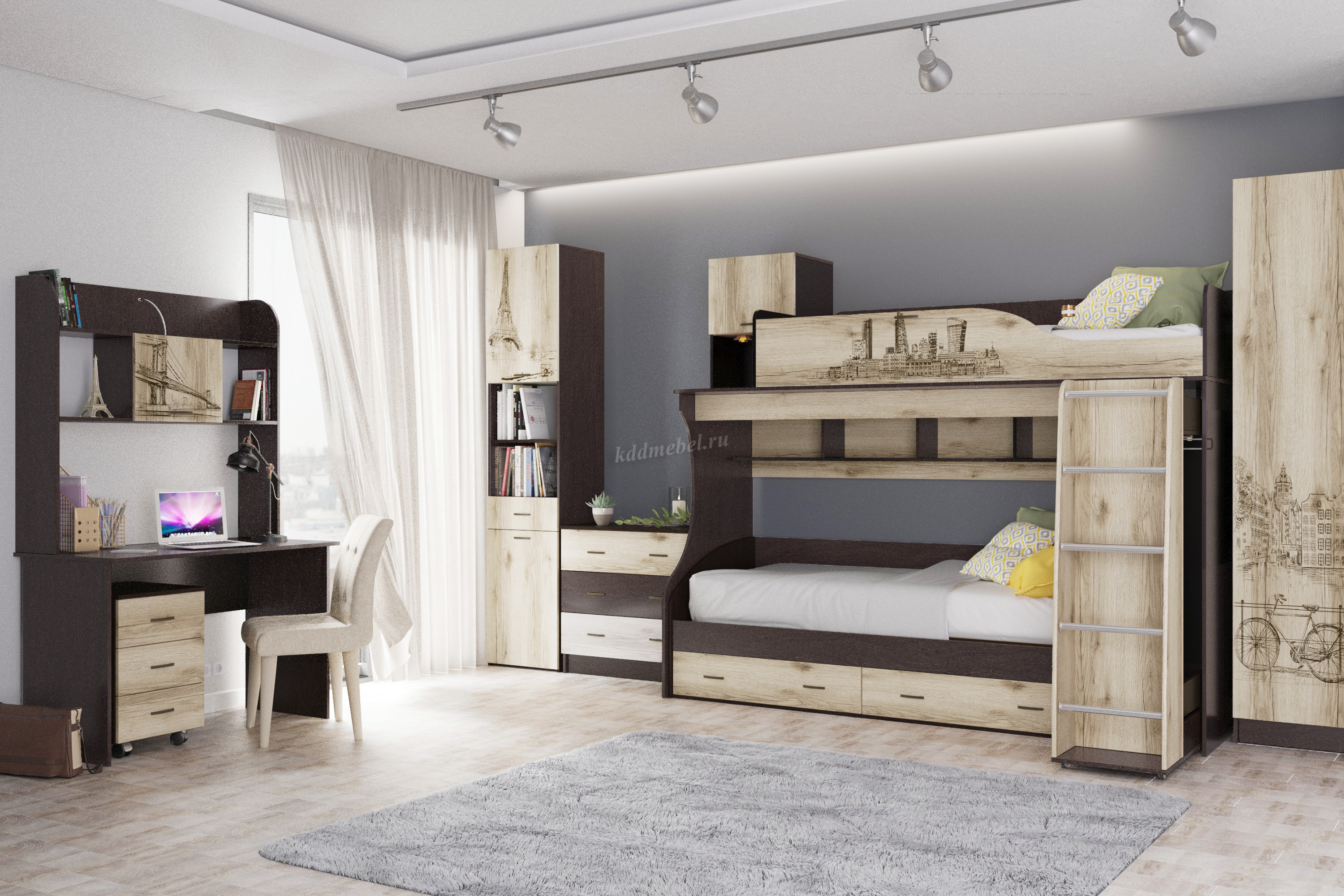 Композиция для детской спальни Орион - идеальное решение как для просторной комнаты, так и для малогабаритной квартиры. Широкий выбор модулей: функциональная кровать-чердак с встроенным шкафом, пенал с выдвижными ящиками, полноценный комбинированный шкаф со стандартной штангой и полками. Классические цвета исполнения прекрасно сочетаются с дизайнерскими изображениями городов мира, наненсенными на фасады методом цветной фотопечати.